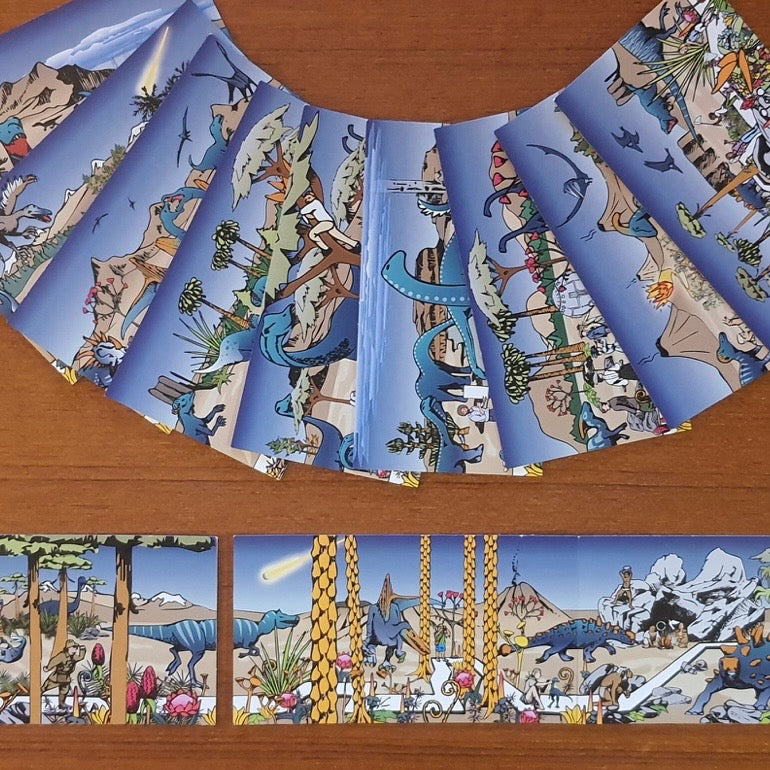 A dynamic Myriorama in which intrepid travellers come face-to-face with dinosaurs from the Triassic, Jurassic and Cretaceous periods. Dinosaurs can be mixed and matched to create your own fantastic beasts, across 12 cards that can be arranged into 479,001,600 panoramic landscape combinations.