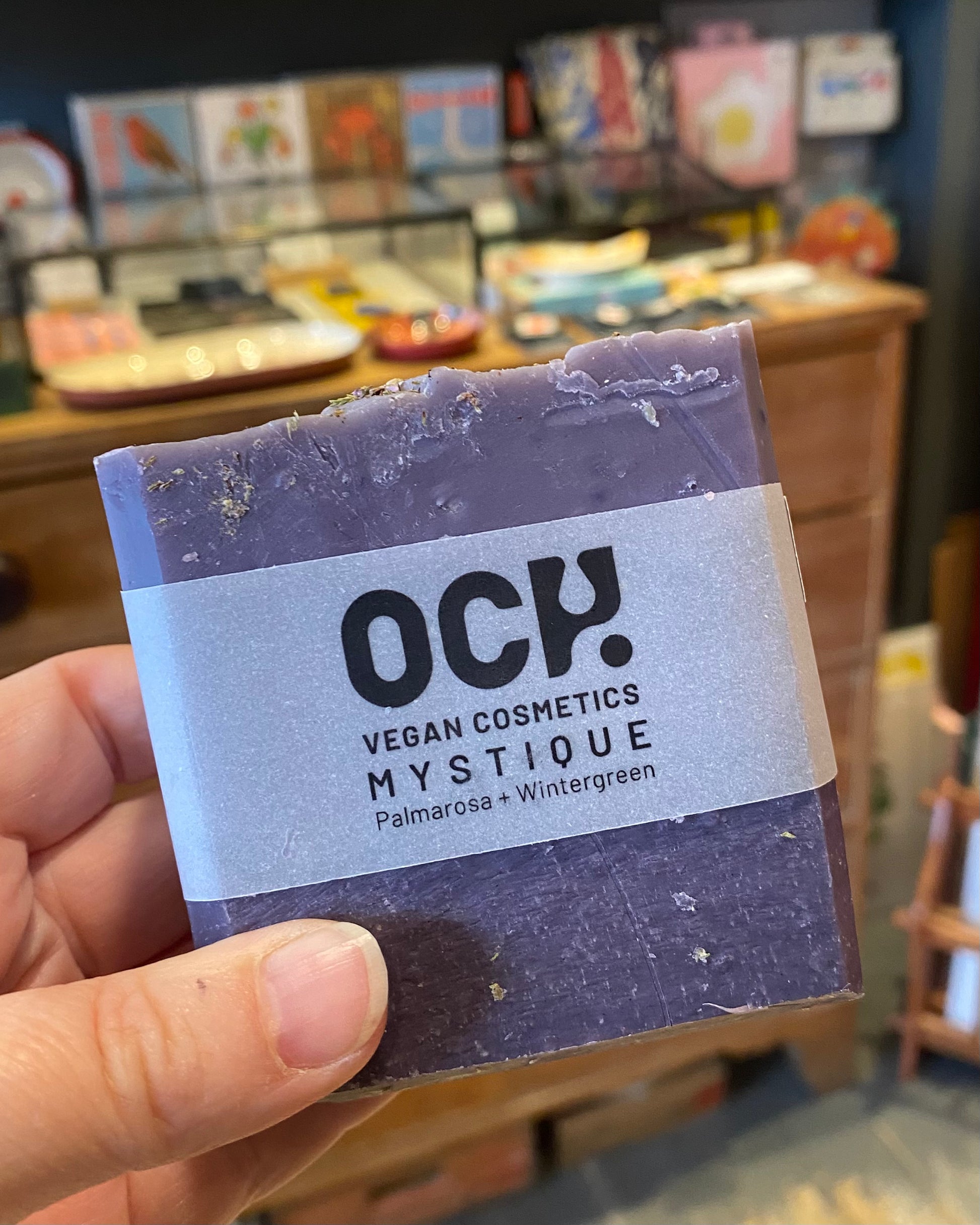 Soap bar made with natural, vegan ingredients such as olive and coconut oils, known for their skin-nourishing properties.