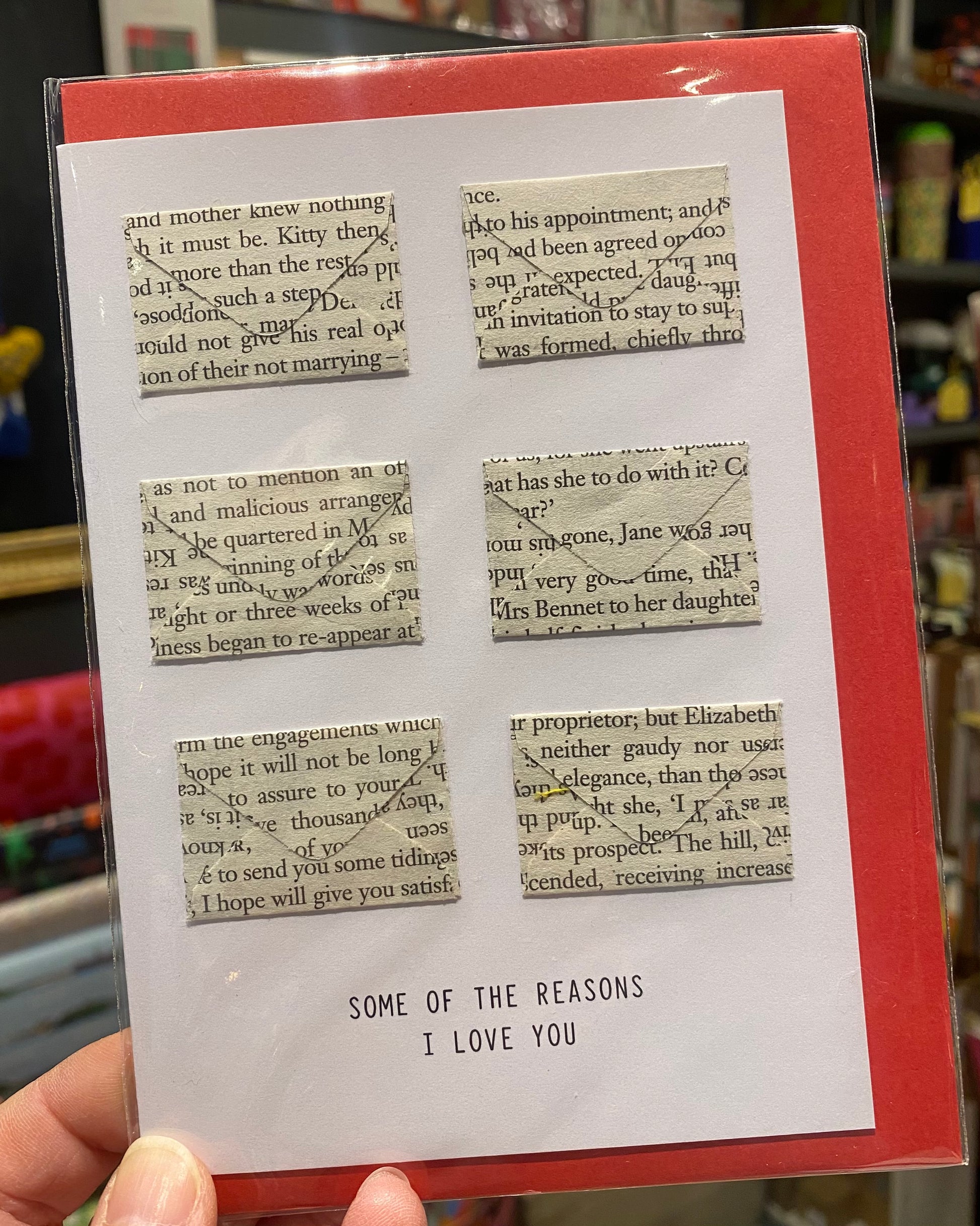 The mini envelopes are hand made from the pages of books by the romantic literary great, Jane Austen. Titles used include Emma, Pride & Prejudice and Sense & Sensibility. They are attached to a greetings card and supplied with six blank mini notecards - so you can fill in six of the many reasons you love your other half! Comes with six mini heart stickers with which to seal your envelopes.