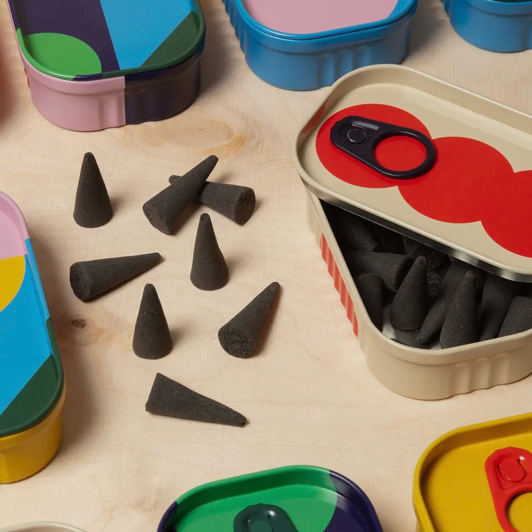 Place a single cone on an insulated incense burner or the upturned lid of this tin. Ensure burner is on a level, fire-resistant surface. Light the tip of the cone until a small flame is established. Once the tip is glowing gently blow the flame out. To extinguish, carefully dip the tip in water.